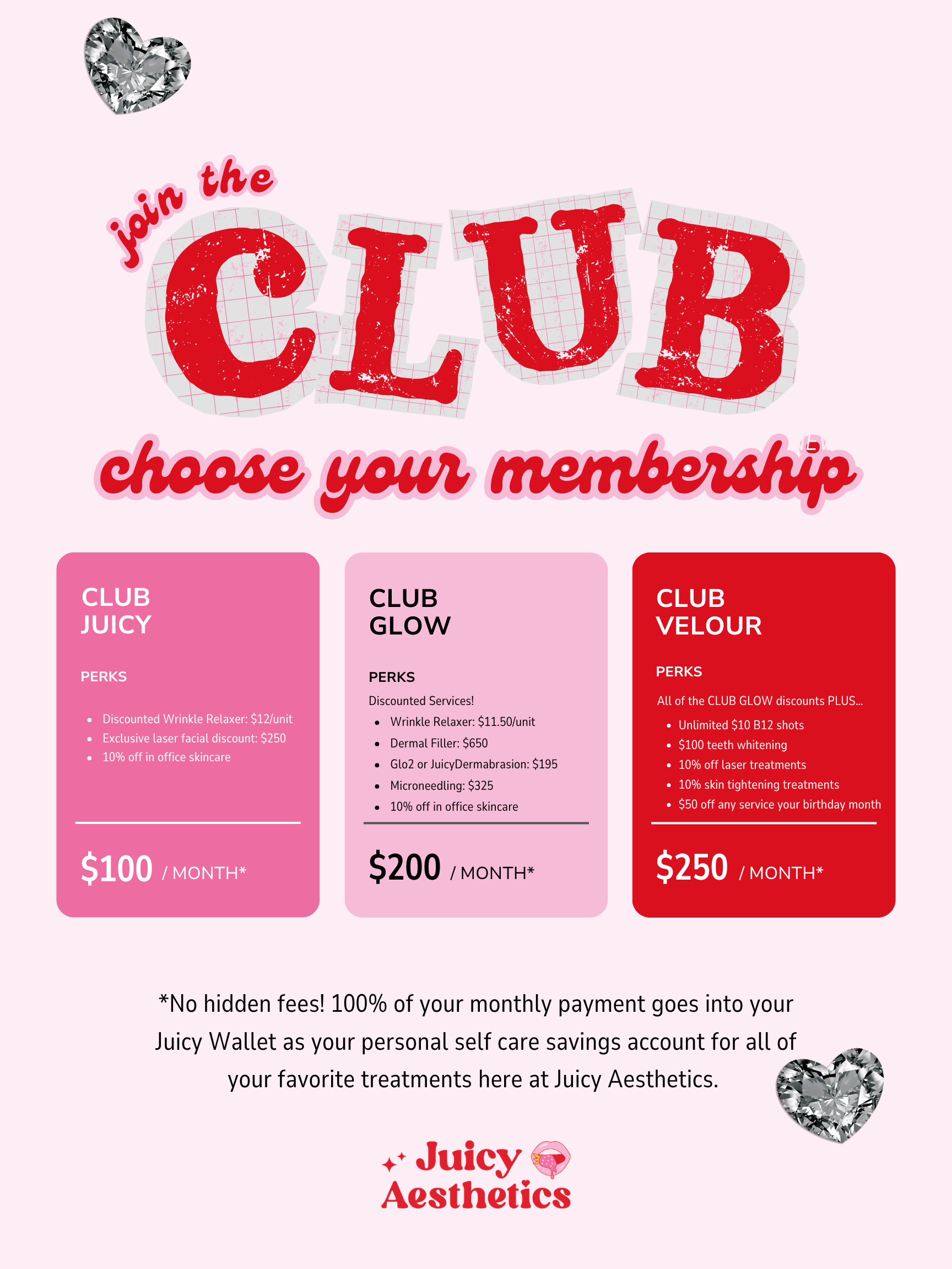 Nope! Zero fees here in The Club. 1005 of your monthly payment goes into your Juicy wallet to use on your favorite treatments here at Juicy Aesthetics.